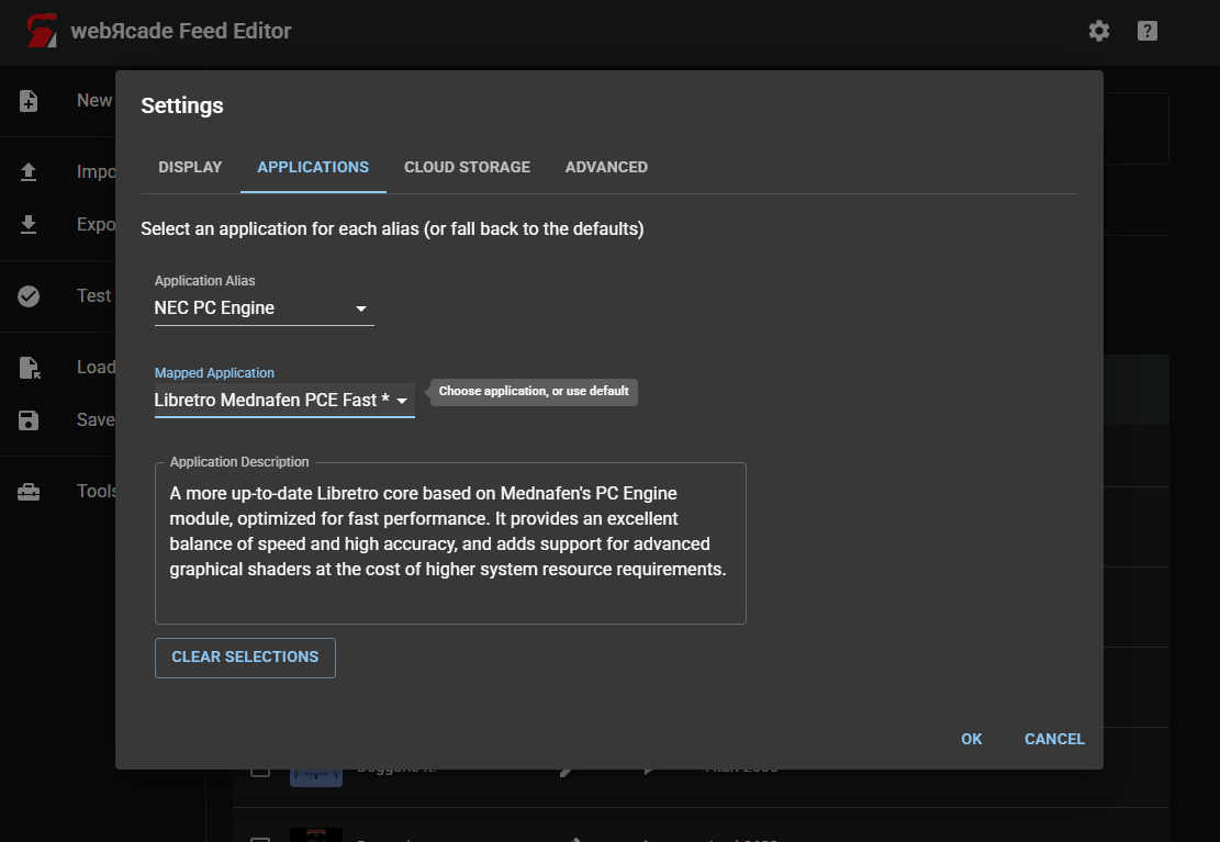 | Application Alias | The alias to configure. Use the dropdown to select from the available aliases (e.g., NEC PC Engine, NES, SNES, etc.). |